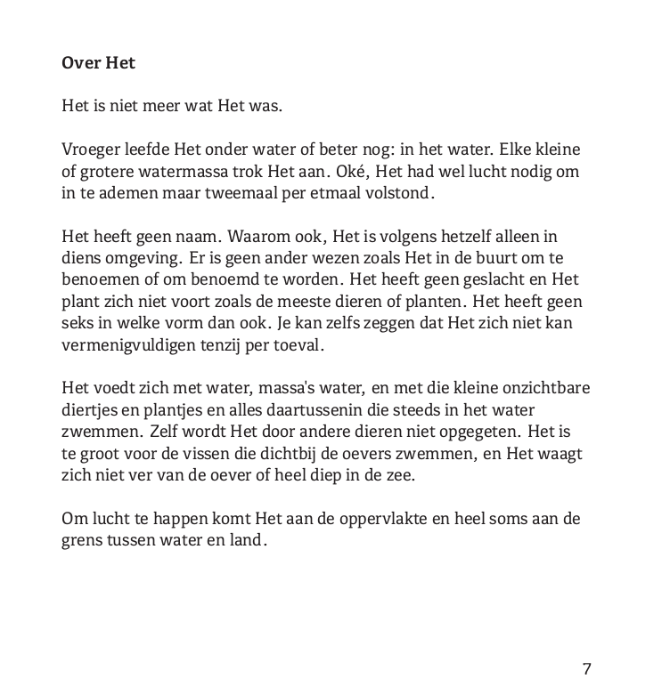 Het heeft geen naam. Waarom ook, Het is volgens hetzelf alleen in diens omgeving. Er is geen ander wezen zoals Het in de buurt om te benoemen of om benoemd te worden. Het heeft geen geslacht en Het plant zich niet voort zoals de meeste dieren of planten. Het heeft geen seks in welke vorm dan ook. Je kan zelfs zeggen dat Het zich niet kan vermenigvuldigen tenzij per toeval.